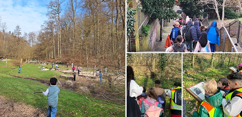 Ob die Lieferung neuer Möbel oder das schöne Wetter – manchmal braucht es nur einen kleinen Anlass, um mit den Schulkindern rauszugehen. Doch eines ist sicher: Mit dem Frühling und der erwachenden Natur beginnt wieder die Zeit für spannende Ausflüge. Die Kinder der Klassen 2a und 2b nutzten das sonnige Wetter für einen Ausflug ins Dambachtal. Die Kinder der Ea und Ed hatten bei ihrem Besuch in der Fasanerie besonderes Glück: Sie konnten einen der Bären während der Futterzeit beobachten.
